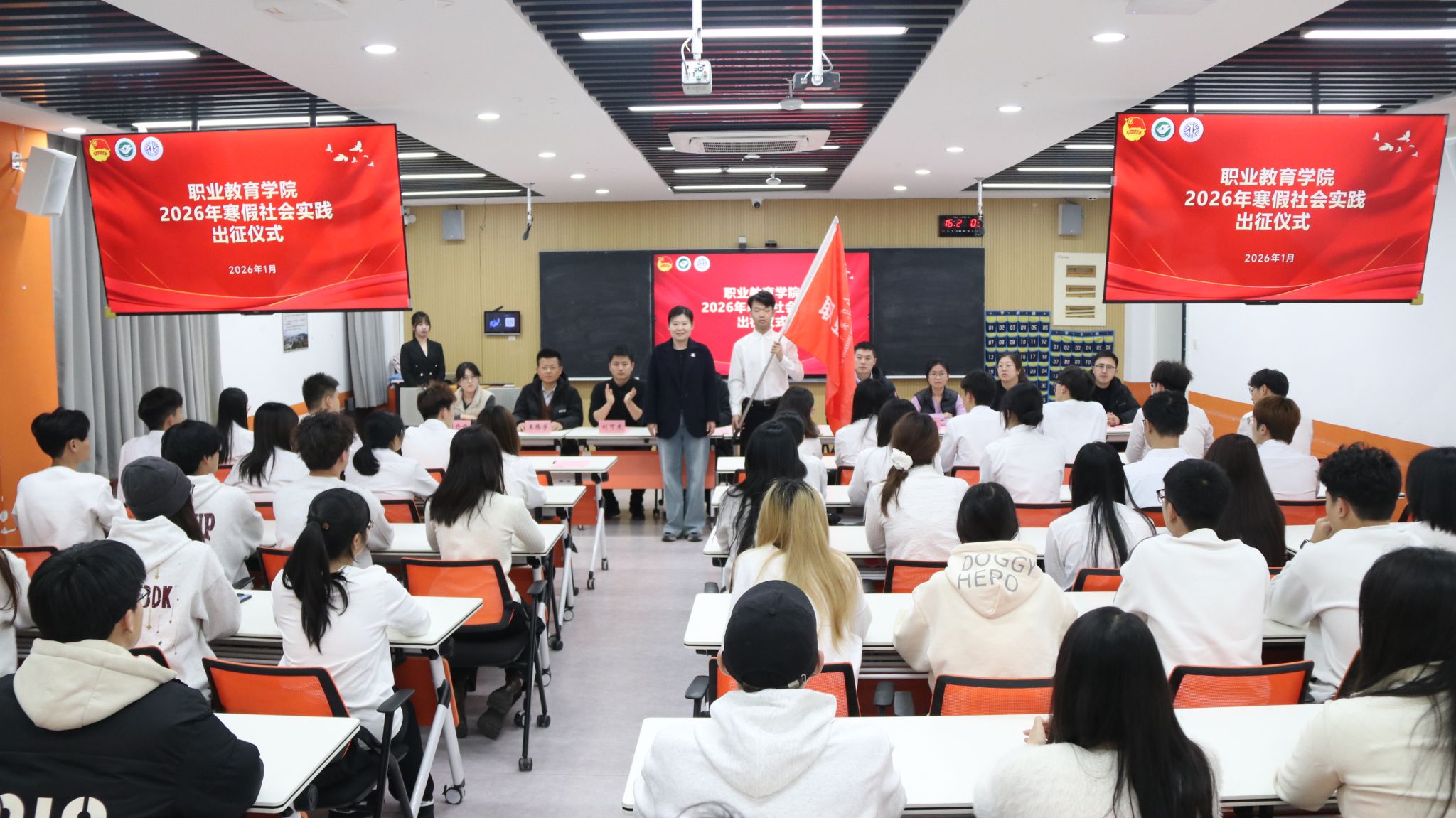 为深入贯彻实践育人理念,引导青年学子在实践中增长长才干。1月14日,职业教育学院举办2026年寒假社会实践出征仪式。学院党委副书记袁中华、全体辅导员、社会实践学生代表共同参加。